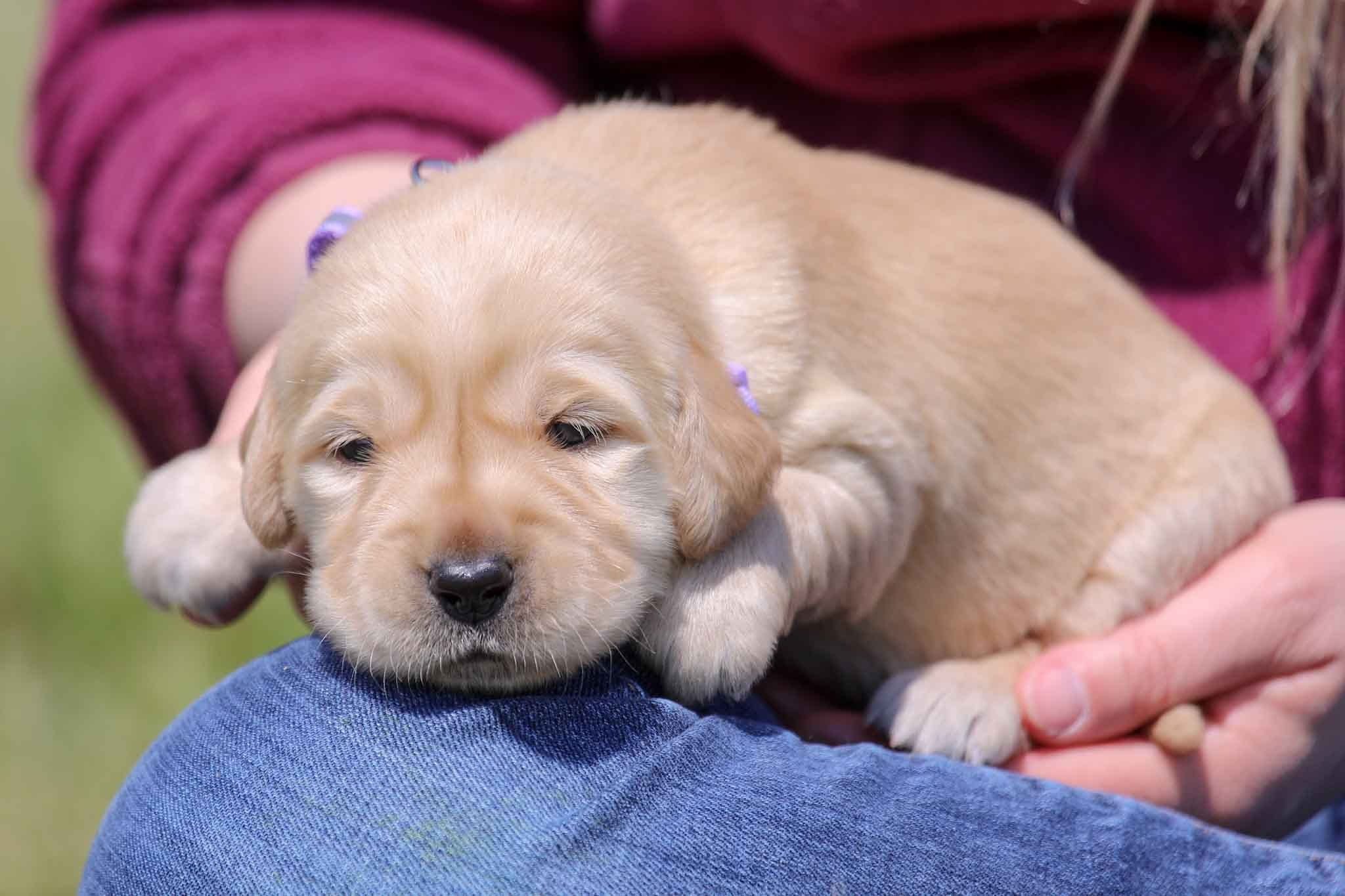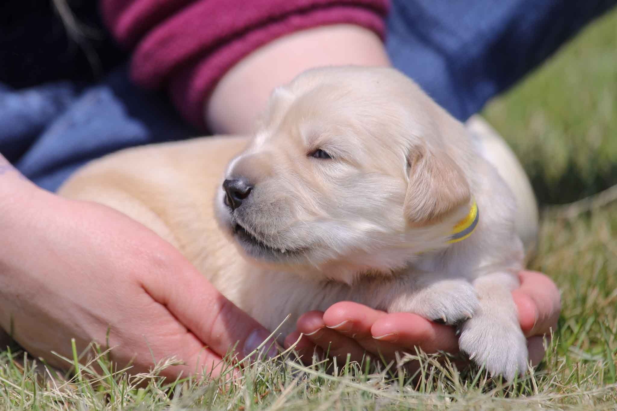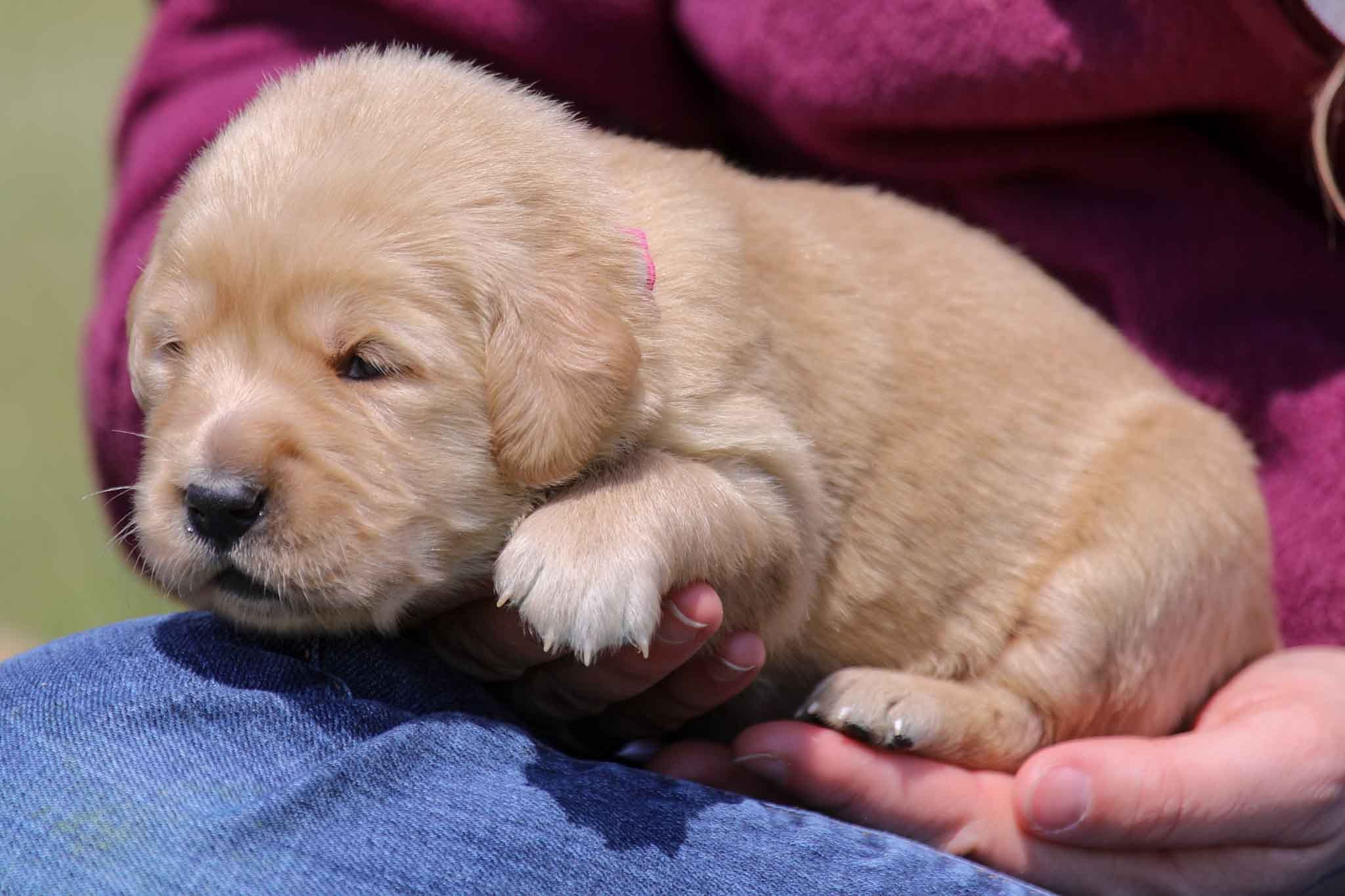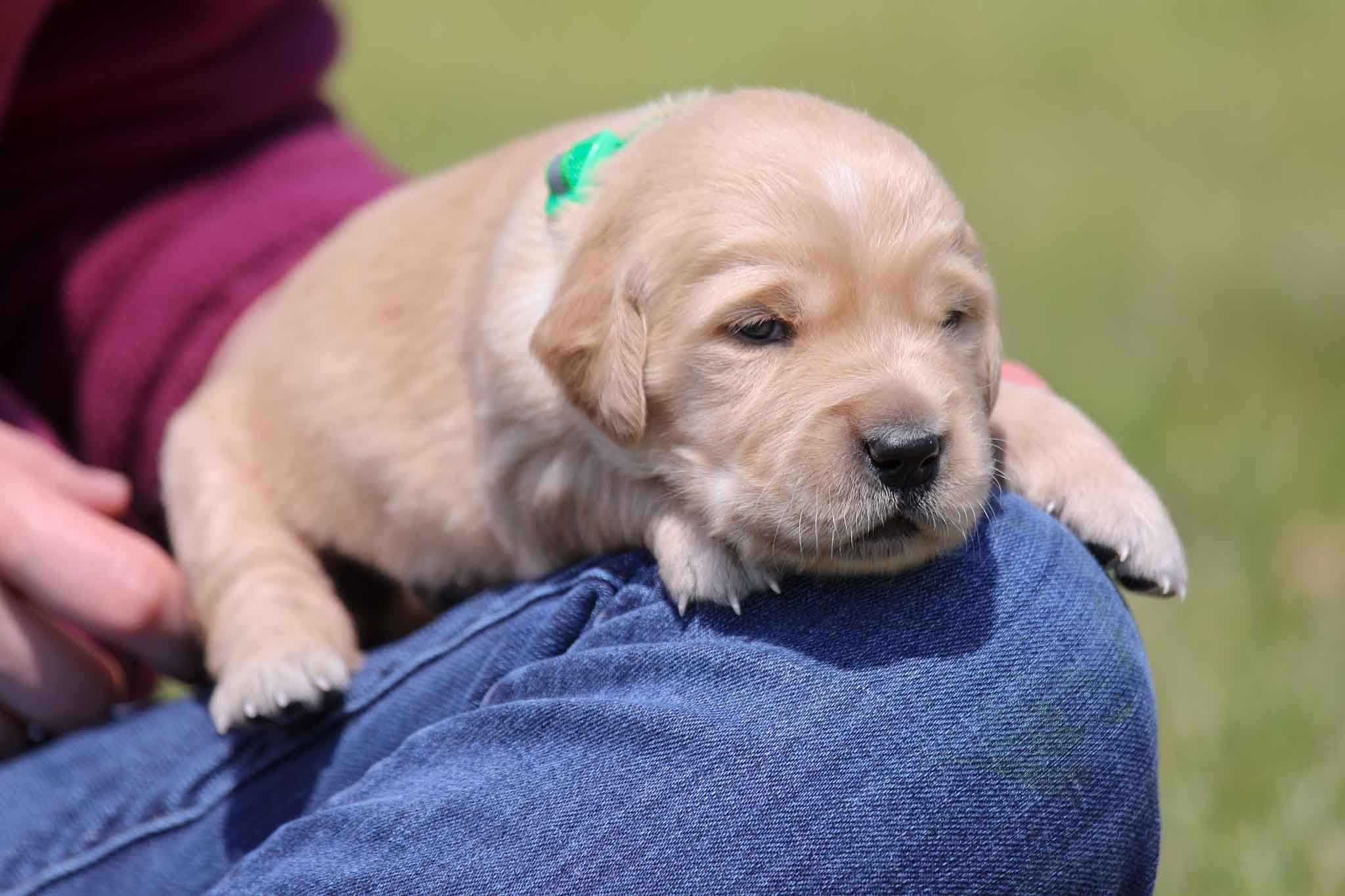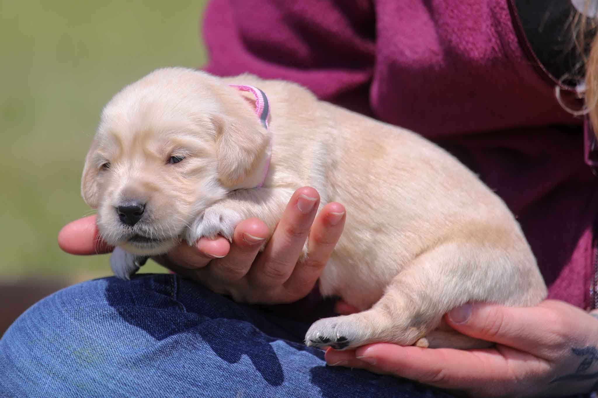 The other day, we took all the puppies outside on a beautiful, sunny, warm day and let them frisk around the yard. The smaller puppies, like Florence’s, move around a bit less than the larger ones, especially in the grass. But they still love the new environment. Each day they get playtime and handling as well as classical music therapy which helps grow their brains leading to a more balanced and mentally mature pup. They also receive special, natural wormers from Amber NaturalZ which help them stay healthy. Utilizing conventional wormers alone can lead to resistance and digestive upset which is why we use a combined approach. We want every puppy to have a good head start on life which means they have the least amount of toxins and the most nutrition. There is only has one female still available from this litter!