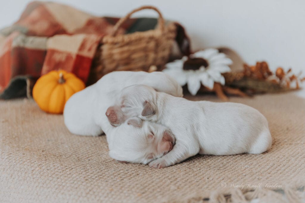 We’re so excited to share that Florence and Freddy’s beautiful English Cream Golden Retriever puppies have arrived! On a crisp autumn morning here in Maine, Florence brought six perfect little ones into the world, three males and three females! Each tiny pup is healthy, thriving, and already capturing everyone’s hearts!